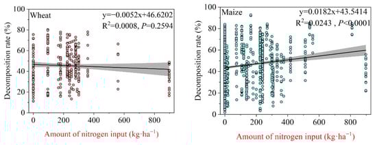 Relationship between the decomposition rate of wheat or maize straw and the amount of nitrogen input.