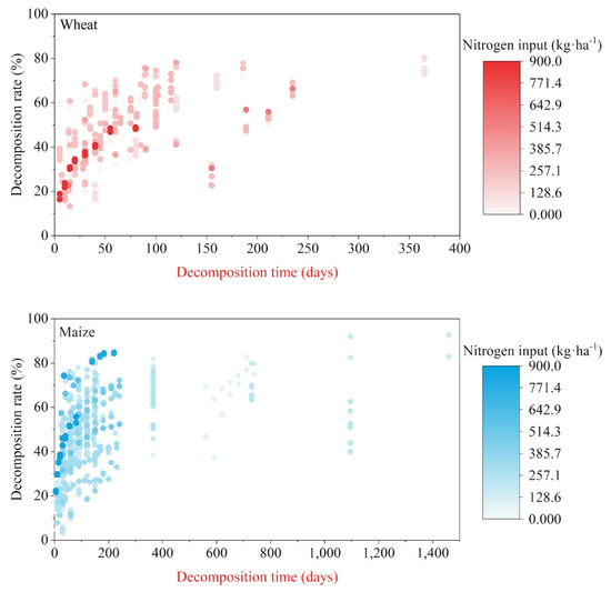 Effect of nitrogen input and decomposition time on the decomposition rate of wheat or maize straw.