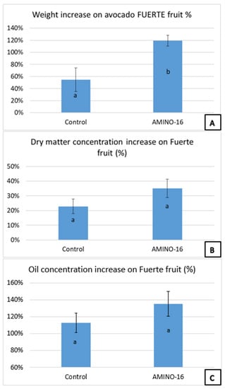 Experiment 3; (A) Weight increase in fresh Fuerte avocado fruit in the Control and AΜΙΝO-16® treatment; (B) Dry matter concentration increase in fresh Fuerte avocado fruit in the Control and AΜΙΝO-16® treatment; (C) Oil concentration increase on fresh Fuerte avocado fruit in the Control and AΜΙΝO-16® treatment. The organic mixture was added by drip irrigation, in three doses of 30 L/dose/hectare. The weight, dry matter, and oil concentration were measured at the beginning of the experiment and during harvest. For each parameter, different letters indicate differences between the values (mean ± SD) of the Control and AMINO-16® treatments, according to Student’s t-test, at p ≤ 0.05.