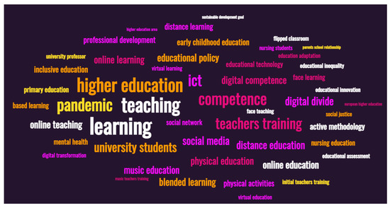 Figure 1 shows a word cloud that compiles the 50 most relevant keywords that have been mentioned in the analysed articles. The size of those that have been mentioned more frequently is bigger than the that of ones that were mentioned fewer times. “Learning” is the keyword that has been used the most (93 times), followed by “teaching” (53 times), “higher education” (43 times), “pandemic” (30 times), “competence” (29 times), and “ICT” (22 times). The frequency of the rest of the keywords is under 20.
