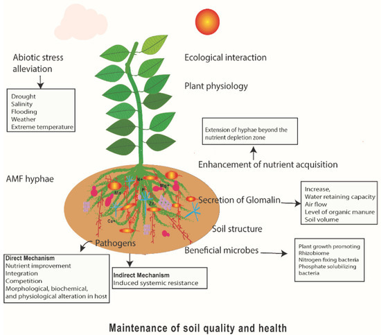 Soil quality depends on the physical and chemical properties, and the diversity, distribution, and activity of the soil biota [35,36,37]. Soil health refers to the ability of the soil to function as a living ecosystem. Soil health is governed by soil quality and thus influences human health via enhancing crop quality. As a beneficial biological tool, AMF maintains soil quality and health by influencing three main factors: soil structure, plant physiology, and ecological interactions (Figure 1) [38,39].