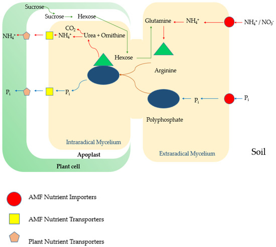 In the phosphorus transport process, Pi is absorbed in the form of negatively charged polyphosphate granules by phosphate importers located in the extraradical mycelium (ERM) [55]. In nitrogen uptake, nitrogen importers take nitrogen in the forms of NH4+ and NO3− and then convert these into glutamines, and further, positively charged arginine is formed [56]. Then, negatively charged polyphosphate granules and positively charged arginine form a complex and are transported to the intraradical mycelium (IRM). In the IRM, arginine is broken down to form the urea and the ornithine. Afterward, the ammonia and the hydrolyzed urea products are transported into plant cells via the symbiotic interface. With the help of arginine, polyphosphate granules are also transported to the IRM, and furthermore, the latter releases Pi to the symbiotic interface (Figure 2). The molecular mechanisms involved in some of these events are still unclear [57]. Scientists have shown that, in a faba bean/wheat intercropping system, AMF symbiosis enhanced root length, density, and biomass in the pure stand wheat system and increased the uptake of P and micronutrients, such as Fe and Zn. Interestingly, wheat intercropping with faba bean increased the P uptake into the wheat plant. AMF do not influence the P uptake in faba beans, either in a pure or intercropping system [58].