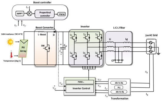 The controllability and observability of the PV system is a complicated task because of its output dependency on variable irradiance and the temperature of the sun. A conventional PV system comprises two independently controlled levels, namely, a DC-to-DC converter and a DC-to-AC inverter [7]. The DC-to-DC boost converter is adopted for the regulation of PV voltage at maximum power point tracking (MPPT) before delivering it for inversion to the AC signal [8,9]. In most cases, voltage source inverters (VSI) are the preferred current source inverters (CSI) due to their simplicity, stable output, and dual control structure, i.e., voltage and current loops [10]. Previously, most of the work has been carried out for modeling and steady state analysis of grid-tied PV system [11,12,13]. However, a very limited study is carried out at transients and fault conditions [14,15].