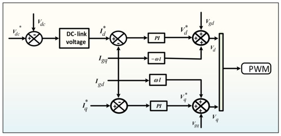 The control structure of VSI with PI controller as error compensator of the variables in rotating synchronous frame (d-q frame) is depicted in Figure 2. The advantage of using natural variables in the d-q frame is its simple control and convenient measurement and analysis due to the nature of dc behavior [45]. It is a double-loop structure of control which gives compensated current references using the PI controller by the outer loop, i.e., the voltage loop. The internal current control loop is used for the regulation of orthogonal components of the current, i.e., real (Id) and Reactive (Iq). However, the reference reactive element is put to zero to maximize the real power consumption, i.e., the unity power factor. Similarly, the external voltage control loop is employed for the regulation of DC-link voltage.