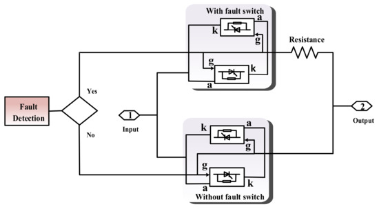 The previously used conventional crowbar circuit to limit fault current is consists of two alternatively operating switches according to the state of system. One switch at a time is conducting, decided by the fault-detection algorithm, i.e., the without fault switch or the with fault switch. During normal conditions, the current follows the path by the conduction of “without fault” switch. Conversely, during a short circuit fault the “fault switch” conducts to divert the fault current to the path with ohmic resistance. Each path comprises dual-directional switches for full-cycle AC waveform flow (Figure 3).
