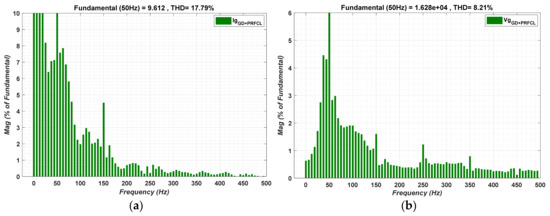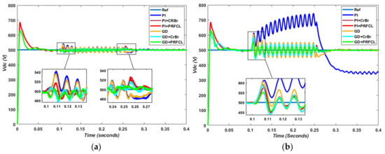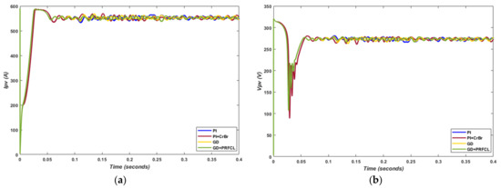 The most basic and important parameter having direct influence over other variables of grid-tied PS is dc-link voltage, and its response is shown in Figure 5 below. During the single-phase fault, time domain specifications such as the minimum magnitude of overshoot, low settling time and peak time with the proposed topology, i.e., GD+PRFCL, is achieved at the start of the simulation, as well as at fault entering and clearing time. Even so, the verse behavior of the dc-link voltage with a PI controller under highly dynamic conditions such as phase-to-phase faults is optimized to acceptable limits with the proposed algorithm, as depicted by Figure 5b.