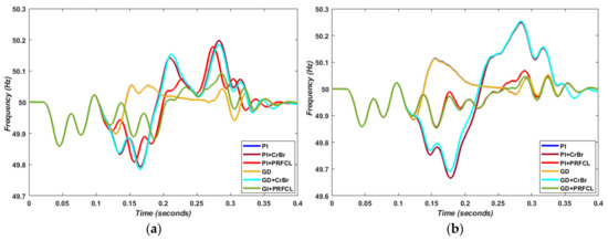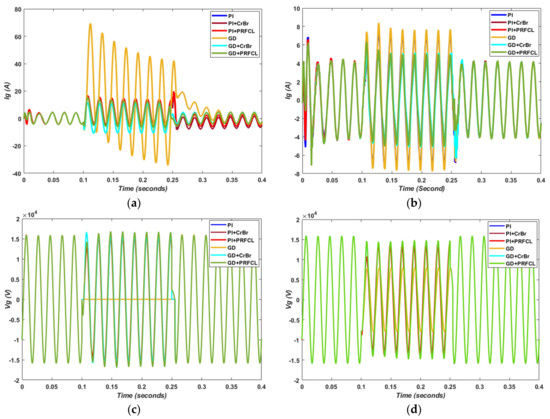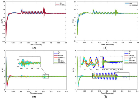 The impact of proposed GD+PRFCL and convention scheme PI+Crowbar over dq-frame current parts is investigated for the P-G and P-P unbalance conditions. The real (Id) current response is approximatly the same during normal time; however, during fault time and fault clearing time, the magnitude of spikes is minimized with the proposed topology. The output behaviour during single-phase fault and double-phase can be analyzed by Figure 6a,b and Figure 6c,d, respectively. It is worth considering the reactive part of the current (Iq) stablized with with low-magnigute oscillations at the start of the simulation run with the proposed metodololy. Morover, during fault time and fault transition times, the disturnace and transients are minimized to a high extent compared with the other combinations of the schemes. Figure 6e,f clearly depicts the efficient response of the reactive (Id) current during both single and double-phase fault with the use of the proposed topology. In the single-phase fault, i.e., Figure 6e, the analysis is difficult due to low severity. However, the double-phase fault, i.e., Figure 6f, clearly justifies the smooth and optimal response of Iq by employing gradient–descent optimization and PRFCL circuitry instead of for the PI controller and crowbar.