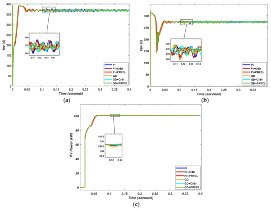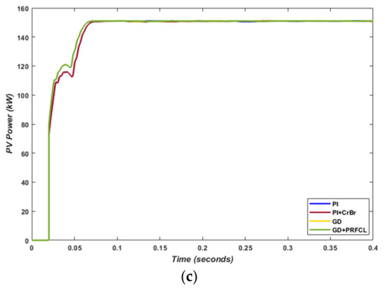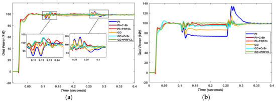 Grid power quality has been improved to the rated 100 kW with the proposed topology. The drop in power during the double-phase fault with conventional PI controller is severe, amounting to approximately 25%, and with high transitional spikes; however, this loss of power is restricted to 13% with the proposed GD algorithm as in Figure 7b. However, by incorporating PRFCL, the power improved to the nominal value and with minimum surges during fault starting and eliminating time, compared with the other possible solutions. Considering the single-phase fault, the loss of power is not prominent, which is approximately 5% without LVRT circuitry; this is improved effectively with both LVRT circuitries. However, the surges caused by switching fault condition are minimized and give ripple-free responses with the proposed GD+PRFCL topology, which is zoomed out for clarification, as depicted in Figure 7a below.