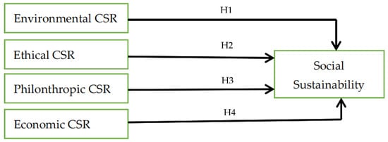 Philanthropic or altruistic CSR activities are linked to a utilitarian standpoint (social care, justice, equity), and this is beyond an organization’s economic and financial benefits [75]. These practices are advantageous for employees, suppliers, customers, collaborators, and society at large. The philanthropic dimension of CSR calls for companies to donate to society in uplifting the quality of life [20]. Thus, serving humanity is the essence of philanthropic social responsibility. This dimension takes care of the well-being of the marginalized and underprivileged or poor people who seriously need others’ support to sustain themselves on earth [78]. Organizations realize their philanthropic responsibilities by offering their money, time, and other resources to welfare organizations at domestic or global levels [79]. These contributions are mostly provided to various worthy causes, including disaster relief, human rights, treatment of poor patients, and education programs in poor countries. In the same vein, the current study tests the following hypothesis: