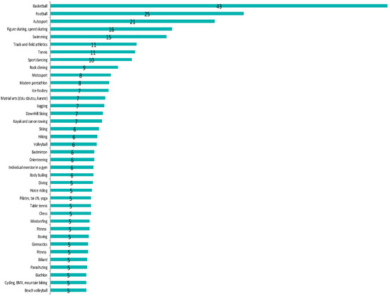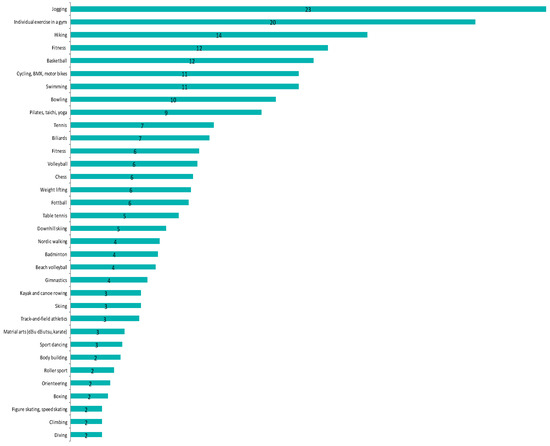 Figure 1, below, shows the importance of individual sports in the active-participation pattern within the sample of participants. The most important sport in terms of participation is jogging (practiced by 23% of participants), followed by gym (20%), hiking (14%), fitness (12%), and basketball (12%). This pattern emphasises sports that can be relatively cheap and easy to join (such as jogging and hiking), health and fitness following the expansion of operators throughout Europe, and basketball, which is a traditionally popular sport in Lithuania.