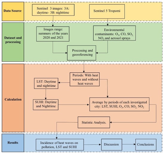 Our research aims to provide a complete analysis of the relationship between heat waves and the three variables indicated. The questions we intended to answer with this study are the following: 1. Can heat waves increase pollutant levels? 2. What influence could heat waves have on the LST and the SUHI? 3. Will this variability be different in daytime and nighttime Sentinel-3 LST values? 4. Can the results obtained in this study influence future urban studies?