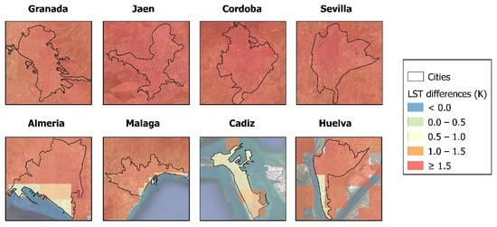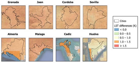 Figure 4 displays the LST values obtained from Sentinel daytime and nighttime images for the periods without a heat wave and with a heat wave. In all eight cities investigated, during the heat wave periods, diurnal LST values were higher than those obtained under conditions without heat waves. The average rise in LST for the eight cities was found to be 3.6 K, the highest increases occurring in the coastal cities of Huelva (8 K) and Malaga (6.1 K). The smallest increases were seen in the cities of Cordoba and Cadiz (1.6 K). The night LST values during the heat wave period were significantly higher than the values recorded at times without heat waves. The average increase in LST in the eight cities was 2 K, the largest increases occurring in Huelva (3.6 K) and Seville (3.5 K). In contrast, the coastal cities of Almería (0.6 K) and Cadiz (0.8 K) gave the smallest increases.