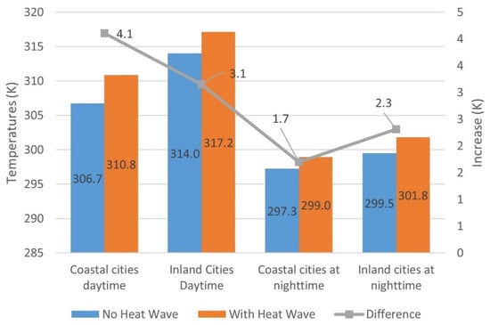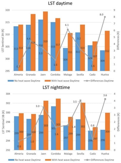 Figure 5 illustrates how the increases in LST generated by heat wave situations present strong spatial and temporal variability. Our results show that the increase in daytime LST was greater in cities located on the coast (an increase of 4.1 K) than in inland cities (a rise of 3.1 K), possibly due to the effects of the breeze. In turn, according to Sentinel 3B data, the increase in LST was greater in inland cities (2.7 K) than in coastal cities (1.7 K). Based on the results obtained, it can be stated that both the day and night LSTs underwent significant increases during the heat wave period; but the mean increase is greater for the daytime reading (3.6 K) than at night (2 K).