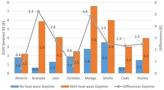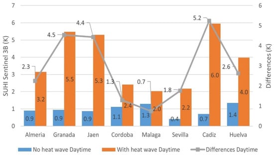 The increase in SUHI is greater in inland cities (2.8 K) than in coastal cities (2.5 K). The data by Sentinel-3B likewise indicate a greater increase in nighttime SUHI for inland cities (3 K) than for coastal ones (2.7 K). It can therefore be affirmed that the heat wave situation causes an increase in the daytime and nighttime SUHI intensities. Indeed, the increase in SUHI presents similar mean values during the day (2.7 K) and at night (2.9 K).