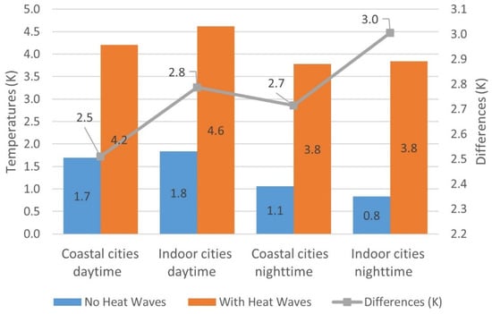 Figure 2 and Figure 3 show the mean differences in daytime and nighttime LST between the periods without and with the heat wave. Figures S1 and S2 in Supplementary Materials show the mean values of daytime and nighttime LSTs without and with a heat wave.