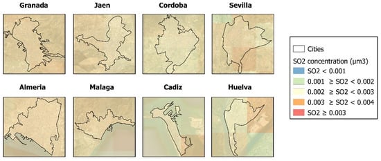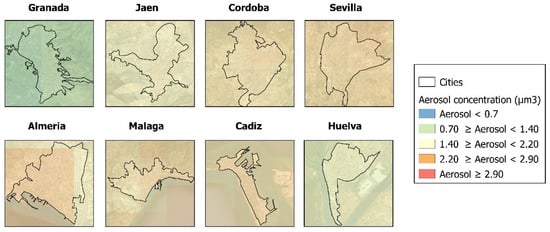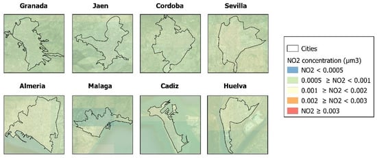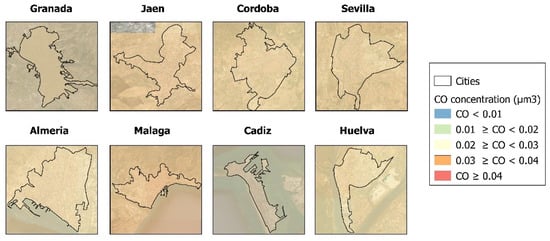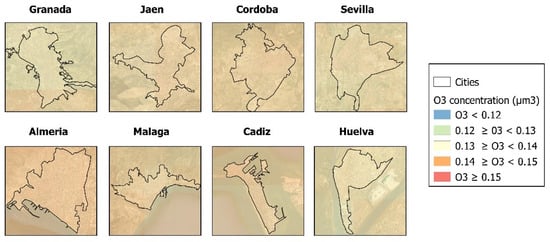 The eight cities investigated are located in southern Spain, in the region of Andalusia, which has an area of 87,315 km2 and a population of 8,329,654. Distinctively, it is the most populated region in Spain and the second largest one (Table 1). According to the Köppen–Geiger climate classification, the region shows different climates. The cities of Cadiz, Granada and Huelva share a Mediterranean Sea climate (Csb), the city of Almeria has a semiarid cold arid climate (Bsh), and the cities of Cordoba, Jaen, Malaga and Seville share a Mediterranean climate (Csa). Hence the region overall has mild, dry summers and humid winters and hot []. Andalusia is bordered by the Mediterranean Sea to the south and mountains to the north, which implies that sea and land breezes strongly impact the eight cities studied.