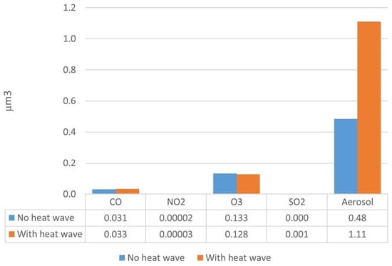 Figure 14 shows, for all the cities, the mean values of the variables investigated both in periods without heat waves and in periods with heat waves. The increases in pollutant concentrations during periods with heat waves for all the cities studied were aerosols (193%), SO2 (165%), NO2 (24%) and CO (8%). A decrease in the O3 variable of 4% was also registered.
