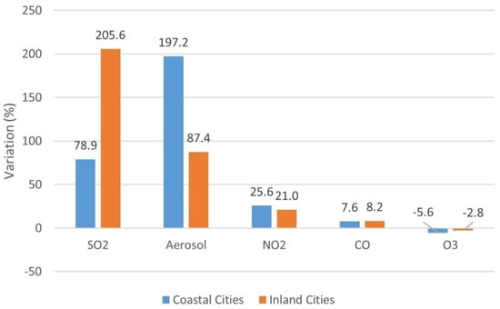 Figure 15 shows the variations suffered by the pollutants by period analyzed and city typology: inland vs. coastal. The average values of the two periods analyzed (with and without heat waves) are given. Clearly, the SO2 pollutants and aerosols present high spatial variability with regard to the type of city. Pollutants CO, NO2 and O3 present similar values, increasing in both types of cities during heat wave periods. Inland, the average increases are: SO2 (+205.6%), aerosols (+87.4%), NO2 (+21%) and CO (+8.2%), while the decrease in variable O3 is −2.8%. The average increases in coastal cities are aerosols (+197.2%), SO2 (+78.9%), NO2 (+25.6%) and CO (+7.6%); the decrease in O3 is −5.6%. It is necessary to indicate that the SO2 measurements of the coastal cities could be affected by the maritime circulation of the ports. However, taking into account that since the circulation is continuous, it would affect both the values obtained during the periods without a heat wave and during the periods with a heat wave analyzed, it would not alter the differences obtained between both periods.