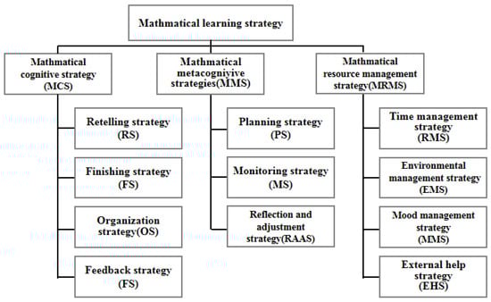 By referring to a large number of studies, we developed the “Questionnaire on Mathematics Learning Strategies for Senior High School Students”. The scale has good reliability and validity. Using the CNKI database as the data source, as of 24 March 2022, the questionnaire has been downloaded 2402 times, cited 93 times, and has been applied in more than 140 schools in Beijing, Tianjin, Chongqing, Shandong Province, etc. The research background of this questionnaire is Chinese high school students, which is more consistent with the research background of this study. According to the characteristics of high school students’ mathematics learning in Jianzha County, we tested and revised the scale many times, and finally determined the questions of the questionnaire. The questionnaire includes 3 main dimensions (mathematical cognitive strategy, mathematical metacognitive strategy, mathematical resource-management strategy) and 11 sub-dimensions (retelling strategy, finishing strategy, organizing strategy, feedback strategy, planning strategy, monitoring strategy, reflection and adjustment strategy, time-management strategy, environmental-management strategy, mood-management strategy, external help strategy) (see Figure 3).
