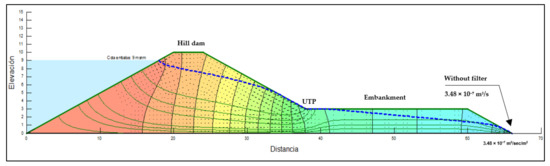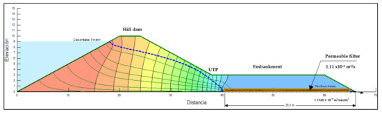 | 12 | 25.5 × 0.5 m horizontal permeable filter | Convergence towards the permeable filter | 1.11 × 10−5 m3/s | Stable dam |