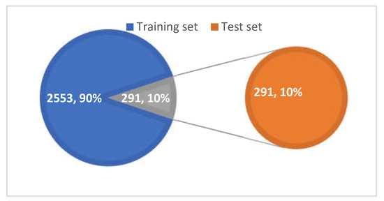 The dataset had a total of 2844 images, as shown in Figure 8. The training sets and validation sets were divided into a 9:1 ratio. In total, 2553 images were used for training validation and 291 images were tested and evaluated by algorithms. In the process of partitioning, one should try to maintain a balance between the number of sample categories in the training verification and test set, and the consistency of the data distribution should be ensured as much as possible.
