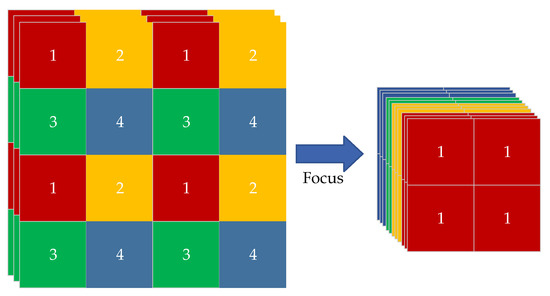 The backbone network consists of the Focus structure [40] and CSP structure [41]. The Focus structure is responsible for slicing the image before it enters the backbone network. As shown in Figure 10, the original 608 × 608 × 3 image is sliced. The feature map of 304 × 304 × 12 is reached, and then the feature map of the 32 convolutional kernels is formed through the convolutional operation. The Focus operation can downsample the input dimensions without parameters and preserve the original image information as much as possible. The CSP structure is a transition of the input feature using two 1*1 convolutions. It is beneficial for improving the learning ability of CNNs [42], breaking through computing bottlenecks, and reducing memory costs.