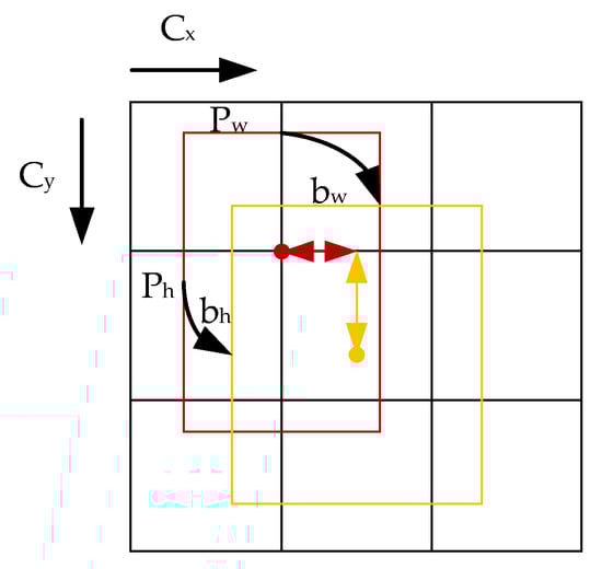 As shown in Figure 11, the blue box is the ground truth box. b x , b y , b w , and b h are the center point coordinates and width–height dimensions of the label bounding box, respectively. c x and c y are the distance between the grid occupied by the center of the label bounding box and the upper left corner of the grid. The red one is the anchor box. p w and p h are the width and height of the prior frame.