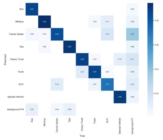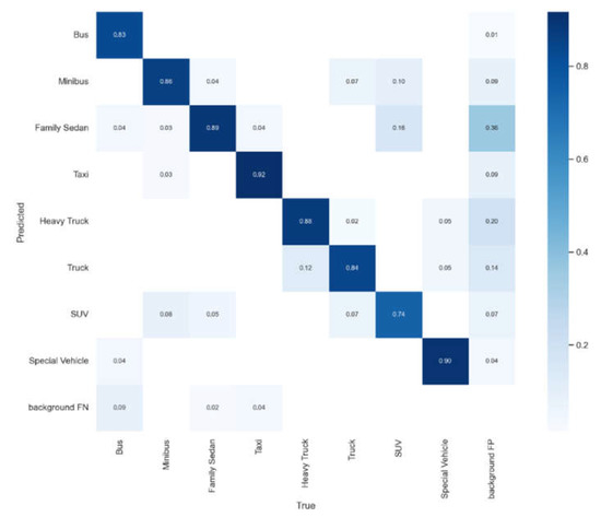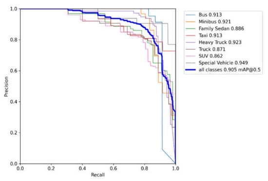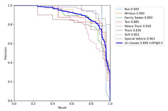 In terms of prediction, the improved YOLO v5 network shown in Figure 3, Figure 4, Figure 5, Figure 6, Figure 7, Figure 8 and Figure 9 and 3–10 had a better performance in the identification of SUVs and Family Sedans. Due to the similarity of the two models, the overall performance of the two models increased by 0.5% and 0.3%, respectively, especially in the case of a smaller calibration frame, and the overall performance was even better.