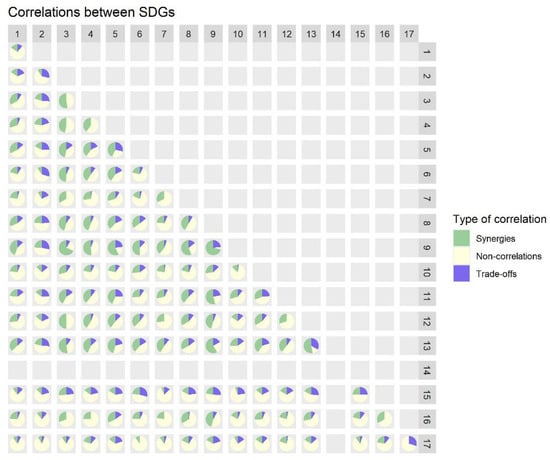 The results of the correlation analysis of all SDG interlinkages based on Austrian data—with 26% synergies, 12% trade-offs and 62% non-correlations—confirm previous findings that synergies outweigh trade-offs [13,14,15,21,41] and that the majority of SDG indicators are actually not linked with each other [13,49].
