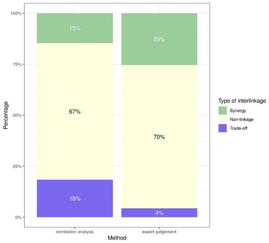 Overall agreement shares for the nexus were relatively high, however, as two thirds of the non-linkages, synergies and trade-offs were agreed upon by both methods. While non-linkages made up the biggest share of investigated indicator pairings, synergies outweighed trade-offs, which is consistent with previous literature [14,15,21,41]. This rather high agreement mainly relates to non-linkages. For both synergies and trade-offs, agreement between the two methods is at around 50%. Interestingly, while experts identified a considerably larger fraction of synergies than trade-offs, the correlation analysis in fact found a higher share of trade-offs than synergies among the nexus indicators. While this is in contrast with both the general picture of all EU SDG indicators in Austria and with previous literature examining SDG interlinkages on a more general level, it supports the findings of previous studies on trade-offs between economic growth and environmental degradation [5,10,31,32].