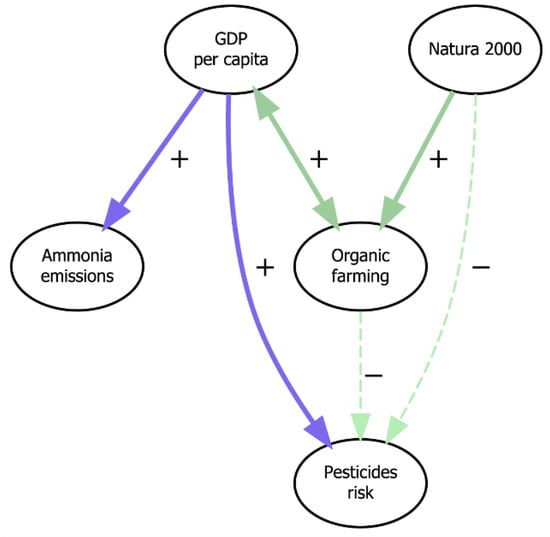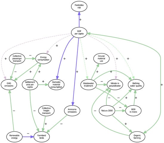 Synergies and trade-offs between agricultural SDG indicators and other economy–environment nexus indicators. Arrows between nodes refer to synergies and trade-offs identified by the experts and confirmed by the correlation analysis. Dashed arrows signify synergies and trade-offs claimed by the experts, but not identified by the correlation analysis. Violet arrows represent trade-offs, and green arrows represent synergies. Plus signs connote a relationship between two indicators where an increase in one indicator trend is associated with an increase in another indicator trend. Minus signs connote a relationship where an increase in one indicator trend is associated with a decrease in another indicator trend. Arrowheads represent the direction of an interlinkage (i.e., driving variable and driven variable) as suggested by the experts.