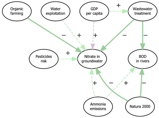 Synergies and trade-offs between water SDG indicators and other economy–environment nexus indicators. Arrows between nodes refer to synergies and trade-offs identified by the experts and confirmed by the correlation analysis. See caption of Figure 6 for a more detailed explanation of the arrows and signs.