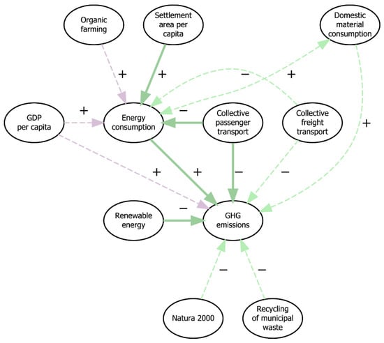 Synergies and trade-offs between SDG indicators from the economy–environment nexus. Arrows between nodes refer to synergies and trade-offs identified by the experts and confirmed by the correlation analysis. See caption of Figure 6 for a more detailed explanation of the arrows and signs.