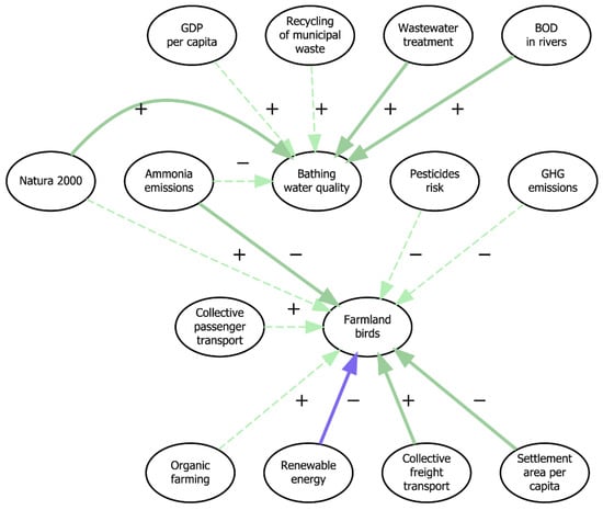 Synergies and trade-offs between ecosystem SDG indicators and other economy–environment nexus indicators. Arrows between nodes refer to synergies and trade-offs identified by the experts and confirmed by the correlation analysis. See caption of Figure 6 for a more detailed explanation of the arrows and signs.