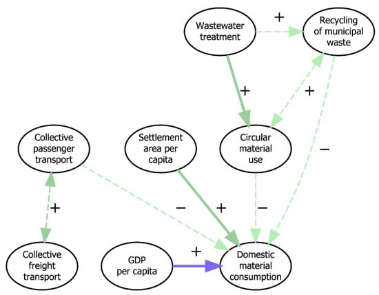 With regard to resource use, both methods revealed a trade-off between domestic material consumption and GDP per capita (see Figure 10). While the experts disagreed on the question of whether this trade-off was reversible by means of technology, most of them indicated that it could be reversed through governance mechanisms. Another interlinkage identified by both methods is a synergistic relationship between domestic material consumption and settlement area per capita. Thus, reducing settlement area per capita could have positive impacts on the amount of materials consumed in Austria. Finally, the share of population connected to wastewater systems with at least secondary treatment displays a synergy with the circular material use rate.