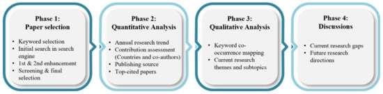 Systematic literature reviews are an effective scientific approach that involves synthesizing knowledge for a specific study subject utilizing a systematic and objective process [27]. It plays an important role, yielding insights into the status of research on a particular topic, identifying knowledge gaps and generating recommendations for future research [28]. Using a method recommended by previous researchers [16,29], MiC research papers related to sustainability published from 2000 to 2021 were retrieved and analyzed to identify current research trends and the main research interests related to sustainability of MiC. Despite the fact that MiC has been employed since the 1960s, MiC- related research has only gained traction in the turn of the century [16]. In addition, after being initially presented in 1994, the definitions and framework for sustainable construction implementation were more strictly established in the 1999 Agenda 21 by International Council for Research and Innovation in Building and Construction (CIB) [30]. Research on the sustainability in construction has consequently gained increasing attention since 2000. Therefore, the last two decades have been chosen as the timeframe for the analysis. The methodology adopted consisted of three steps: (1) paper selection; (2) quantitative analysis, and (3) qualitative analysis (Figure 1).