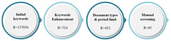 To improve the coverage of the included studies in a systematic literature review, a variety of relevant databases are normally used [31]. However, here, Scopus was the sole search engine due to its wide coverage, high accuracy, and the ease with which structured queries could be constructed compared to alternative literature databases such as Google Scholar, Web of Science, and the ASCE library [32,33,34].