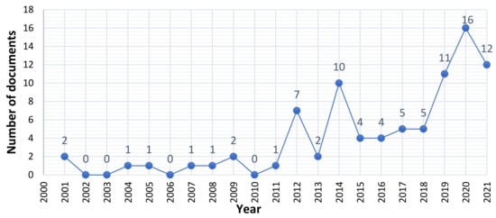 Research publications are a major pathway that enable researchers and academic institutions to affect industrial practice [38]. The relevance of the geographical distribution of the research being reported in these publications is based on our belief that the quantity of academic publications on a specific subject in a country is likely to reflect how far industrial practice and innovations advance on the subject in that country [35]. Figure 3 shows the number of annual MiC research publications globally that are related to sustainability over the two decades from 2000 to 2021.