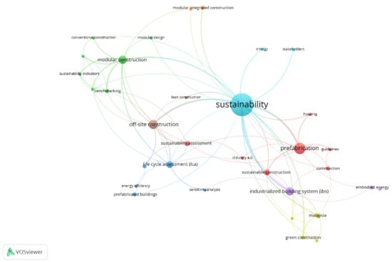 Table 6 presents the statistical details for the most active keywords in the papers published on sustainability and MiC. Here, the link determined the network’s complexity among keywords and the total link strength indicated the interrelatedness of the keywords. The keyword mapping utilized VOS Viewer’s keywords’ co-occurrence analysis (Figure 4); the occurrence threshold, which was set to 2, identified 32 relevant keywords out of the 211 considered. “Sustainability” was the most repeated keyword, followed by “Prefabrication” and “Offsite Construction”. While these keywords reflect the major usage found in the literature, less frequently repeated keywords covered more tightly focused knowledge topics. Total link strength was then considered to identify relevant subfields and research issues. For instance, keywords that identified specific subjects in MiC research, such as “Life cycle assessment (LCA)”, “Bench marking”, “Green construction”, “Life cycle performance”, and “Sustainability criteria”, scored total link strengths of 14, 10, 9, 8, and 6, respectively. Broader research themes identified in the literature will be discussed in the next section.