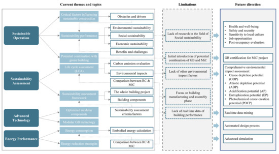 Sustainable development has long been a topic of interest for researchers in many different fields. For those working on MiC, sustainability is an important focus, accounting for 10.3% of the papers published, comparable to the numbers published on construction operations, building design, management aspects, and information management technologies [16]. This section presents the thematic analysis conducted to identify the current trends in MiC research from the perspective of sustainability.