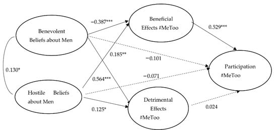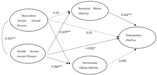 Standardized solution of the model testing the relations among men’s benevolent and hostile sexism toward women, beneficial and detrimental effects of the #MeToo campaign, and intentions to participate in the campaign (Study 1). * p < 0.05. *** p < 0.001.