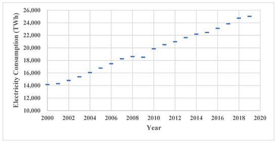Electricity consumption in the world between 2000 and 2019 in the world [1].