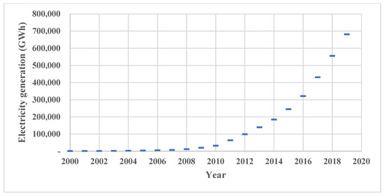Electricity generation by PV cells between 2000 and 2019 in the world [1].