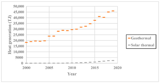 Heat generation by solar thermal and geothermal systems between 2000 and 2019 in the world [1].