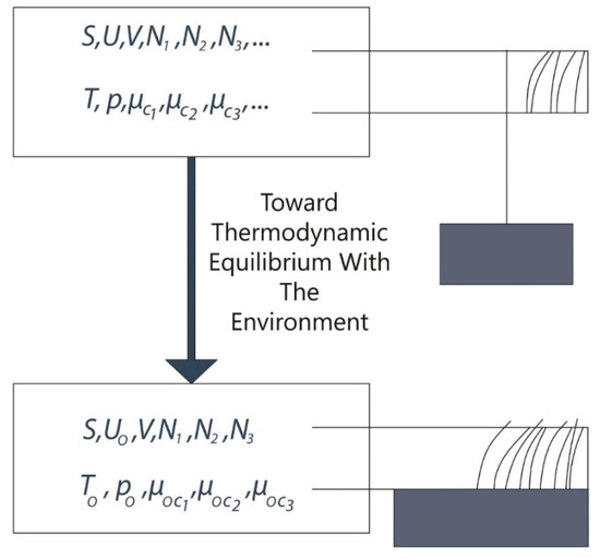 A system can benefit from exergy concept and its analysis by providing a good revenue for itself and by finding the demolitions occurring in different parts through applying the exergy analysis and using the possibilities and chances to improve the system performance. When the system and its surrounding reach equilibrium, the amount of work performed is characterized as exergy [36]. Based on Figure 6, N, U, V, S, T, p and are characterized as mole of various chemical components, energy, volume, entropy, temperature, pressure and the chemical potential of components, respectively. The exergy concept has been widely used in various energy systems such as heat exchangers [37], power plants [38] and many other renewable energy systems [39,40]. Also, the analysis on PV/T systems [41,42] is performed by the exergy concept used by various scholars. Considering a simple PV/T system utilizing fluid flow as coolant, shown in Figure 7, according to Ref. [43], overall exergy inlet can be determined as follows: