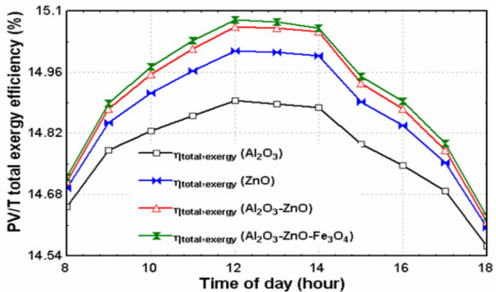 The PV/T system overall performance is affected by its operating fluid [52,53]. In order to boost the output of the PV/T system through heat transfer, nanofluids can be beneficial [54], as they can transfer the heat more properly due to their progressive features [55,56,57]. Aberoumand et al. [58] declared a higher exergy efficiency is caused in PV/T systems by using Ag/water nanofluid with various flow rates instead of water. Increased mass flow rates and concentrations of Ag/water nanofluids are their main distinguishments that improve the efficiency. Compared with a PV system that uses water instead of an improved cooling system, utilization of nanofluid with 4% wt concentration and turbulent flow can create a 50% and 30% increment in system exergy efficiency, respectively. Adun et al. [59] analyzed a PV/T system utilizing a ternary nanofluid, Al2O3-ZnO-Fe3O4/water, and found that the mixture ratio of the particle influences the system performance. Furthermore, the exergy analysis revealed that solar irradiance pattern is observed in the system total exergy efficiency. In addition to the mixture ratio and concentration, other specifications of the applied nanofluid can influence the PV/T system performance [60]. As an example, applying various methods such as one-step and two-step ones for preparing the nanofluids and also the type of nanostructure material used can differentiate the PV/T systems’ exergy efficiency as they affect the nanofluids, as well. Regarding the mentioned approaches, Parsa et al. [61] used one-step and two-step approaches in order to prepare Ag/water nanofluid in three concentrations of 1%, 3% and 5% and the results revealed, one-step method contributed to a higher exergy efficiency for PV/T system compared with the cases of using the two-step methods. Regarding the effects of nanostructure materials on PV/T system performance, findings of Sangeetha et al. [62] demonstrated that among all the three nanofluids that they applied including the Al2O3/water, MWCNT/water and TiO2/water being fixed at the volume ratio of 0.3%, using the MWCNT/water nanofluid and Al2O3/water and TiO2/water afterward lead to the highest exergy efficiency. Various exergy efficiencies are revealed in PV/T systems based on the applied nanofluids. As an example, in one of the studies [63], after the utilization of Al2O3/water, ZnO/water, Al2O3-ZnO/water and Al2O3-ZnO-Fe3O4/water nanofluids, it was the Al2O3-ZnO-Fe3O4/water followed by Al2O3-ZnO/water that maximized the exergy efficiency of the system, as revealed in Figure 8. Furthermore, Sopian et al. [64] evaluated the impact of factors such as material and configuration on electrical exergy of PV/T systems. There were four various cases of PV/T with water, PV/T with water and PCM tank, PCM with nanofluid and nano-PCM tank and conventional PV module in their analysis which among all of the analyzed cases, systems applying the PV/T with nanofluid and nano-PCM had the maximum electrical exergy. Furthermore, based on the analysis, in case of the PV, PV/T with water, PV/T with water and PCM and PV/T with nanofluid and nano-PCM, the mean electrical exergy efficiency was 8.84%, 10.53%, 11.83%, and 12.05%, respectively.
