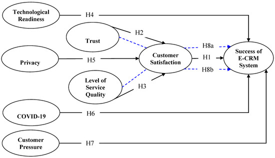 Clearly, more in-depth research is needed for e-CRM. Consequently, this study introduces a novel research framework for analyzing the key variables influencing the effectiveness of e-CRM systems. Specifically, this study looks into the direct and indirect manifestation of trust, privacy, COVID-19, technological readiness, and customer pressure level of service quality through customer satisfaction which impacts e-CRM success. It is hoped that the gap identified within the literature (see Section 3) will be adequately addressed by this study.