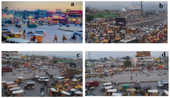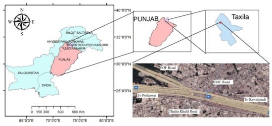 Taxila is an old city founded in 1000BCE and was considered to be the heart of Buddhism. The Achaemenids ruled this city around 600BCE, followed by the Greeks, Mauryans, Indo-Greeks, Scythians, Parthians, Kushans, White Huns, and lastly, the Hindu Shahi, in the 10th century CE. It is located 25 km northwest of the Twin cities of Islamabad and Rawalpindi. The Taxila intersection is chosen as the point of interest because it is located at a key location on the National Highway, N-5, the longest National Highway of Pakistan, which starts from Karachi and ends at Torkham, covering 1819 km. It is the most important intersection on this highway, as discussed in the previous study [34]. Currently, it is the hub of several businesses in the region, resulting in numerous movements; however, the rapid growth of motor vehicles in an urban environment causes critical issues such as congestion caused by human activities, which reduces the true width of the roadway. All of this adds up to a congested intersection. The situation is exacerbated by heavy traffic from the nearby industrial estates (Hattar Industrial Estate, Punjab Small Industries Estate, Heavy Mechanical Complex, and Wah Industries Limited). The most noticeable effect of this congestion is the increased travel time, especially during peak hours.