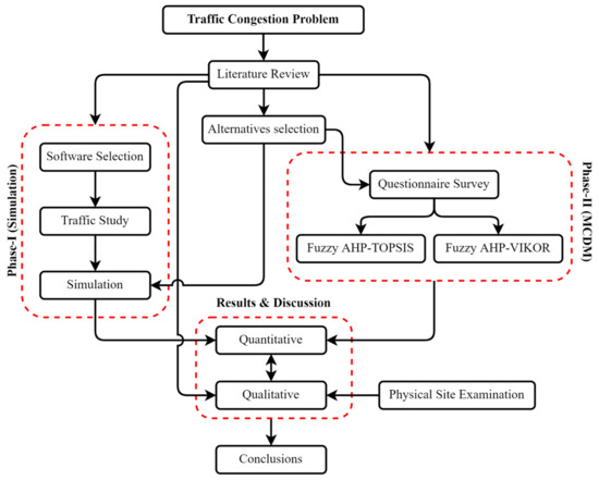 The research methodologies were applied to gather important information about traffic congestion in Taxila. This research used MCDM (fuzzy AHP), the Technique for Order of Preference by Similarity to Ideal Solution (TOPSIS), Vlsekrzterijumska Optimizacija I Kompromisno Resenje (VIKOR), and AIMSUN software. From the literature, we selected different criteria and alternatives. A survey was conducted among experts and analyzed the opinions through MCDM; with the fuzzy AHP, we calculated the weights of the criteria, and with the TOPSIS and VIKOR, we calculated the best alternative based on expert opinion. Furthermore, site visits in the identified areas for traffic congestion were conducted. The visits were conducted on different days, from 7 a.m. to 7 p.m. These observations aimed to quantify the vehicular volume circulating on these sites. The recordings made with the camera were later used to calculate the number of cars flowing in each intersection lane separately. The findings were used as input to the traffic software AIMSUN, based on the real-time data and traffic flow during peak hours. Finally, the results were compared, and a suitable alternative was selected. Formal mathematical techniques, modeling, and simulation systems were examined to control, measure, and manage traffic flow.