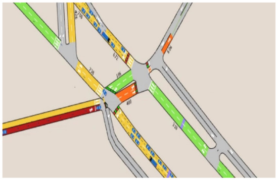 AIMSUN uses dynamic exploratory tasks, implicit route selection models, and validation techniques to verify the simulation. The AIMSUN microscopic simulator demonstrates how these characteristics may be employed [38]. Building an AIMSUN model requires two types of information: supply data and demand data. Supply data involves transportation networks and services related to mobility, whereas demand data include OD matrices for each category of vehicle and time brackets [39]. To better satisfy the objectives of the ITS system assessment, an advanced transport analysis, and ATMS, AIMSUN has created a microscopic traffic simulator. The simulator’s integration with AIMSUN/ISM (intermodal strategy manager), which is a flexible visual environment for model manipulation, a simulation-based traffic analysis, and advanced traffic management techniques assessment, emphasize the description. The AIMSUN/ISM scenario study module creates and simulates the traffic management methods. The (OD Tool) makes and manipulates origin-destination matrices that reflect the mobility patterns required by a dynamic traffic analysis. The matrix calculation algorithms were created utilizing the EMME/2 transportation planning programmer, which has a customizable interface. AIMSUN generates a wide range of information, including flow rate, density, journey duration, delayed time, and speed. The output may be customized at numerous levels, including the overall system output, segment output, turning action output, and stream output (set of consecutive sections) [40,41].